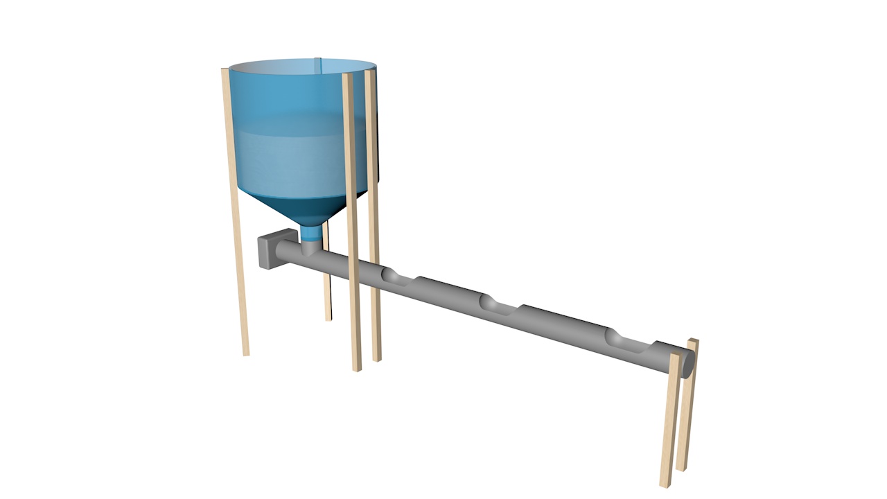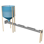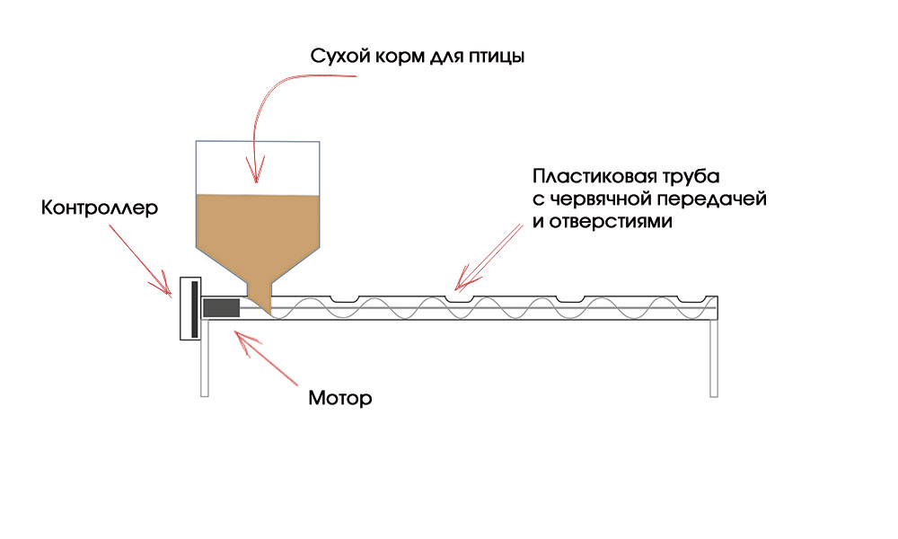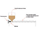 - Из емкости сухой корм попадает в пластиковую трубу с червячной передачей.