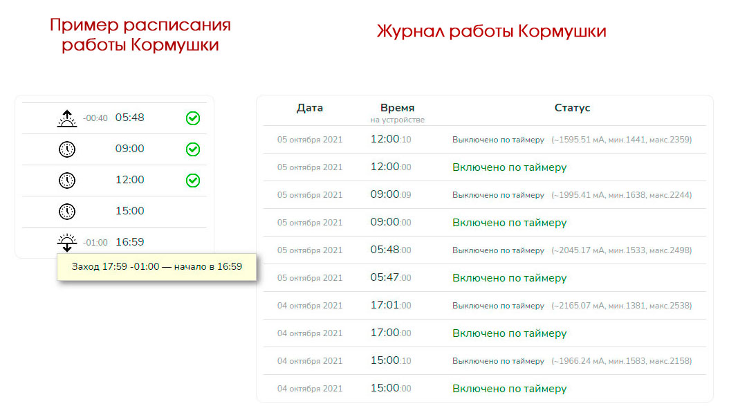 Расписание работы кормушки задаётся на сайте my.lenfer.ru в Личном кабинете пользователя. Можно задать, как точное время включения (например, 13:10), так и время в привязке к восходу/заходу солнца (например, восход + 1 час).