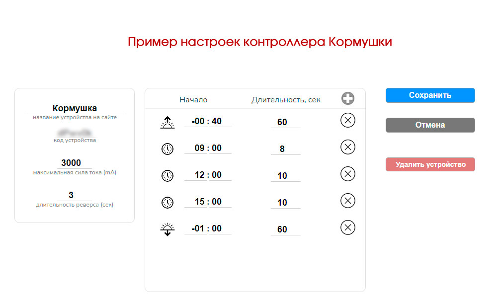 - По клику на "шестеренку" откроется окно настроек контроллера. Там можно задать: название Кормушки, которое будет видно на кнопке (вверху страницы).