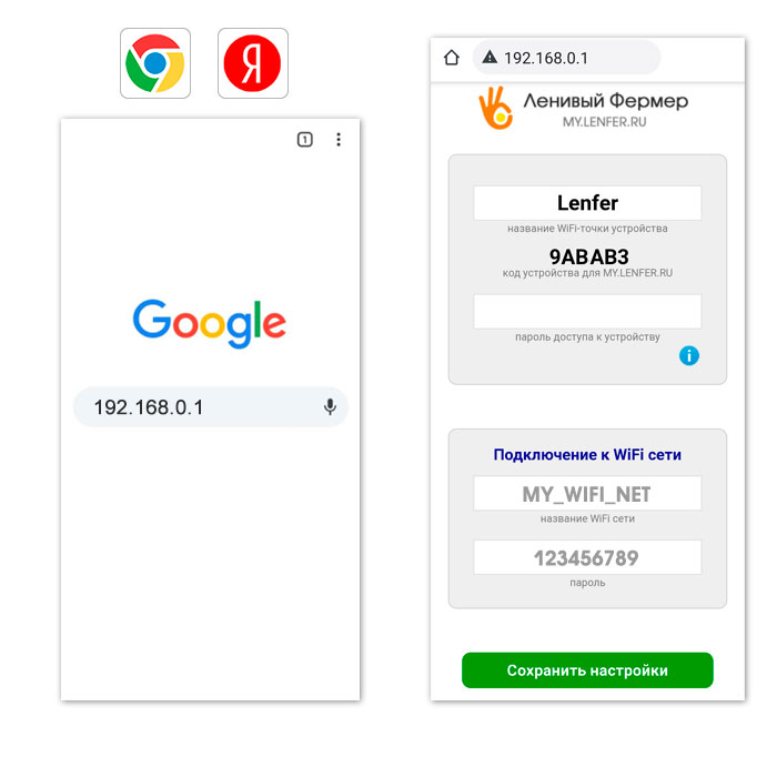 Кстати, после изменения названия WiFi-точки и нажатия кнопки "Сохранить настройки", необходимо будет переподключиться к точке заново. Для этого надо зайти в Настройки телефона (раздел WiFi), обновить список доступных WiFi сетей, выбрать точку доступа уже с новым название и подключиться к ней. А дальше по тому же сценарию - открыть браузер и перейти по адресу 192.168.0.1